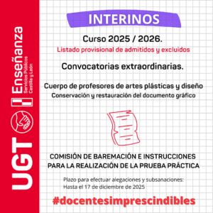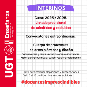Interinos. Curso 2025 / 2026. Convocatorias extraordinarias. Cuerpo de profesores de artes plásticas y diseño. Conservación y restauración de textiles. Listados provisional de admitidos y excluidos