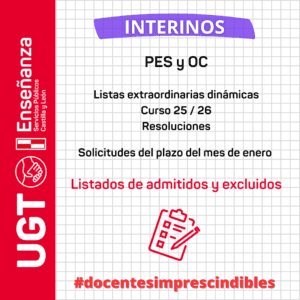 Interinos. PES y otros cuerpos. Listas extraordinarias dinámicas. Curso 25 / 26. Resoluciones. Solicitudes del plazo del mes de enero. Listados de admitidos y excluidos.
