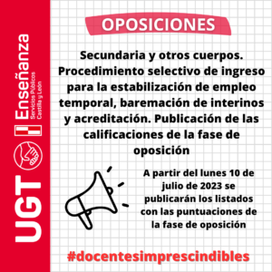 La Resolución de 11 de julio de 2023, de la Dirección General de Recursos Humanos (112.2 KB) (2 páginas) aprueba los listados provisionales de participantes de los cuerpos de profesores de enseñanza secundaria, profesores especialistas en sectores singulares de formación profesional, profesores de escuelas oficiales de idiomas, profesores de música y artes escénicas y profesores