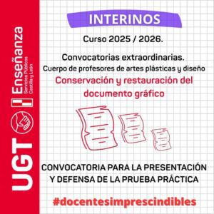 Interinos 2025 / 2026. Convocatorias extraordinarias. Cuerpo de profesores de artes plásticas y diseño: Conservación y restauración del documento gráfico. CONVOCATORIA PARA LA PRESENTACIÓN Y DEFENSA DE LA PRUEBA PRÁCTICA