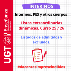 Interinos. PES y otros cuerpos. Listas extraordinarias dinámicas. Curso 25 / 26. Resoluciones. Solicitudes del plazo extraordinario del mes de septiembre. Primera publicación. Listados de admitidos y excluidos.
