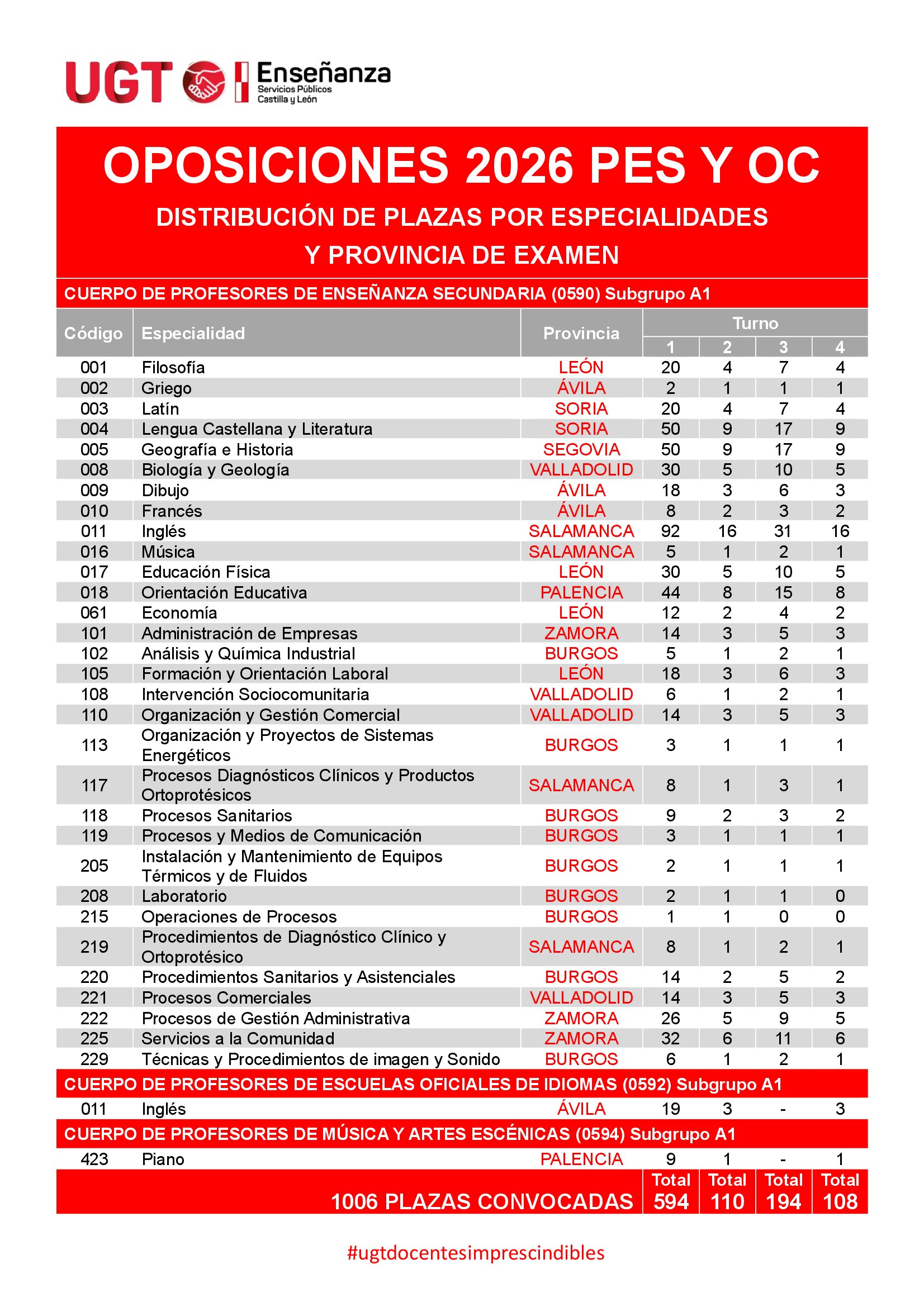 OPOSICIONES SECUNDARIA Y OTROS CUERPOS: PLAZAS OFERTADAS POR ESPECIALIDADES Y PROVINCIAS DE CELEBRACIÓN