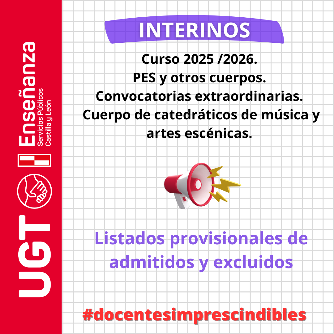 Interinos. Curso 2025 /2026. PES y otros cuerpos. Convocatorias extraordinarias. Cuerpo de catedráticos de música y artes escénicas. Varias especialidades. Listados provisionales de admitidos y excluidos