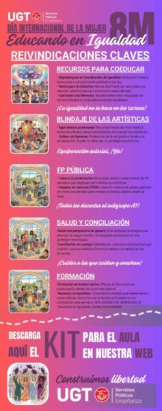 A lo largo de estos días, hemos comprobado que el compromiso del profesorado con una educación feminista es inquebrantable, pero desde UGT advertimos de que este esfuerzo no puede seguir descansando exclusivamente sobre el voluntarismo de las plantillas. Hoy cerramos los cuadernos en clase para llamar a la participación en las plazas, trasladando a las Administraciones una hoja de ruta sindical que exige pasar de la retórica a los presupuestos.