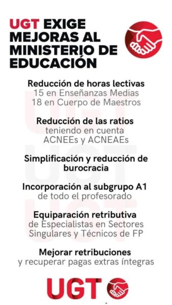 Desde el Sector de Enseñanza de UGT Servicios Públicos seguimos trabajando en el grupo de trabajo que el Ministerio tiene abierto con las organizaciones sindicales para la mejora de las condiciones laborales del profesorado de la enseñanza publica no universitaria, como camino para llegar a una negociación en mesa sectorial lo más pronto posible para que las justas reivindicaciones que desde UGT llevamos pidiendo tanto tiempo para la mejora del desempeño docente sean de aplicación YA!!!